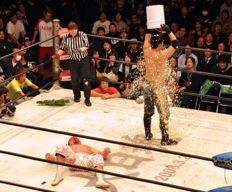 そのジンギスカンに使用したジンギスカン鍋は、20年前に初めてどっこい酒場でジンギスカンを食べた時の鍋を、店の閉店した記念にマスターから譲り受けた物です。 10年振りくらいに火を通した訳ですが、鍋の大きさやらデザインから当時が偲ばれます。 一緒に鍋を囲んだヤドカリ氏とも、どっこい酒場では何遍も呑んだ間柄ですから、二十年の歳月なんてあっと言う間な感じです・・・。 鍋には何故か・・・ヤドカリ氏の家で栽培されている巨大エリンギやら・・深谷ネギやらが非合法に持ち込まれて投入されて行きます・・・。 鍋やら食材やら持ち込む本当に迷惑な人達です・・・。 ジンギスカン鍋なんて穴も開きませんから、焦がした処で死ぬ迄使えそうな代物です・・・。 コレからも家宝として、後世に伝えて行ければと思います・・。 それともう一つ!目出度い情報が!! 本日未明に発表された2009年東スポプロレス大賞の、年間ベストバウトに、11.20葛西純対伊東竜二戦(於・後楽園ホール)が輝きました!!。 年間何試合行なわれて居るか把握出来ないプロレスリングの試合の中で、最も印象に残った試合が大日本プロレスの試合だったとは、嬉しい限りであります。 当日は撮影で会場には伺えませんでしたが、6年越しの因縁の対決ですから・・・会場の熱気も然る事乍ら、セコンド陣の緊張度も凄かった様です。 しかも嬉しい事に、当日使用されたマットは2008年3月にsasakittyが大日魂と描いてファンの皆さんの寄せ書きと併せて作り上げたマットです。 数多くの大会や、練習ですっかり貫禄の出たマットに成ってますが、2009年のプロレス界の最高の試合に参加させて頂いた様で、本当に有り難い物です。 闘った葛西選手も伊東選手も素晴らしい試合を見せて頂きましたが、メインイベント迄会場の熱気を作り出した、1試合目からセミファイナル迄闘った全ての選手、数多くの裏方さん達の情熱が、あの試合を紡ぎ出したと云う事は、紛れの無い事実です。 インディープロレスと呼ばれるプロレス興行ですが、プロレスに対する情熱や愛はメジャーもインディーも、どインディーも関係無いと云う事が、認めて貰えた日の様な気分です。 プロレスは観客と選手とで造り出す最高のエンターティメントですな・・。 葛西選手・伊東選手 本当に凄いな!!。 |