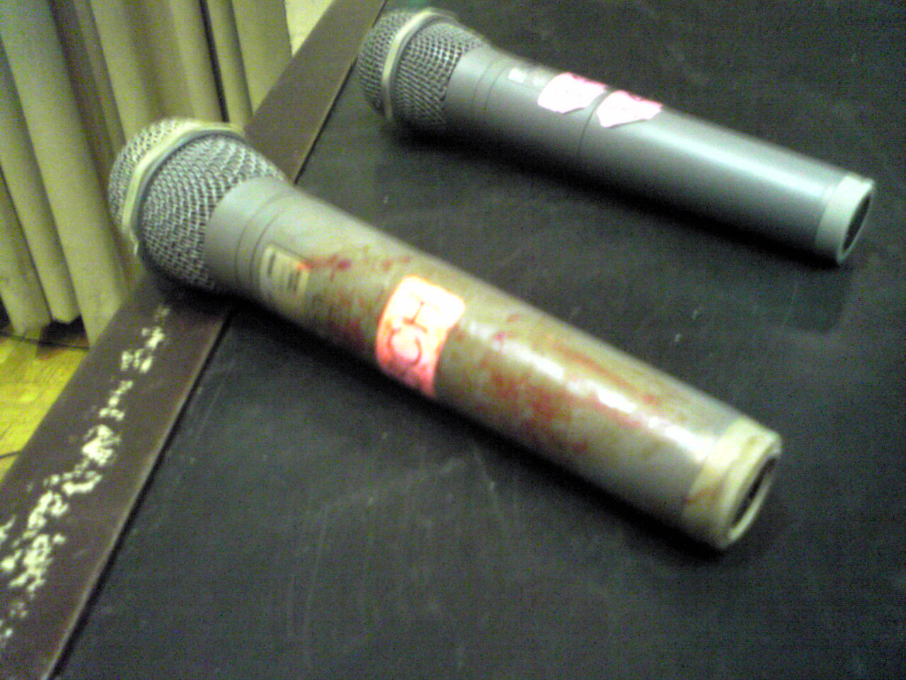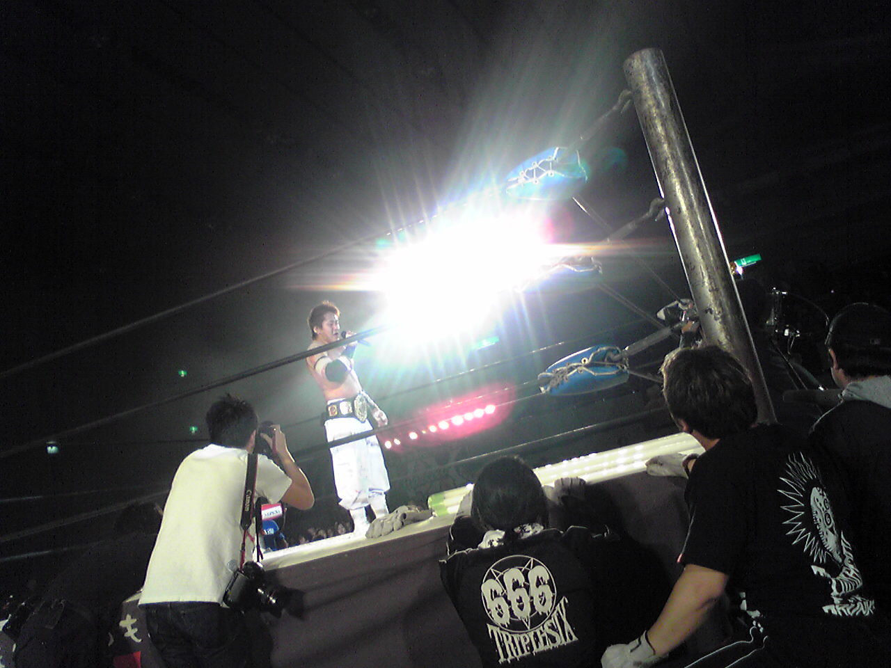 昨年の御好評に引き続き、今年も開催される、大日シェークスピアシリーズ第二弾の構成とキャスティング・リサーチの為に後楽園ホールへと行って参りました・・・。 昨日のメインイベントは、7年振りに開催された最侠タッグリーグ戦の決勝戦。 デスマッチヘビー王者宮本裕向・佐々木貴(sasakittyでは在りません)組対竹田誠志・木高イサミ組と云う、大日本マットに新風を吹き込む新たなるタッグチームの登場な訳です。 大日本プロレスさんと初めてお仕事を御一緒させて頂いてから、もう何年にも成りますが、確実にデスマッチ・・・プロレスの内容が進化を遂げて居るのが改めて実感出来た素晴らしい大会でした・・。 ケガやアクシデントに因る欠場者が何人も出て仕舞った事は非常に残念ですが、予定調和で終わらない所が大日本プロレスの見所とも言える所ですな。 新たに大日本のタッグチャンピオンの座を手に入れた竹田・木高選手に対しても、虎視眈々とその座を脅かそうと成長を続ける更なる若手達の出現・・、まだまだドラマは続く訳ですな・・・。 画像は・・・試合後の竹田選手が使用した後楽園ホールのワイヤレスマイク。 竹田選手は試合中、深い傷を負ったものの、セコンドに付いて居た井上選手に因る応急手当で試合を続行・・・。 決勝戦ならではの緊迫した場面に、選手・関係者全てのこの試合に賭ける意気込みを感じました。 目の前で繰り広げられる、プロフェッショナルな闘いに携われるのは、本当に有り難い事です。 |