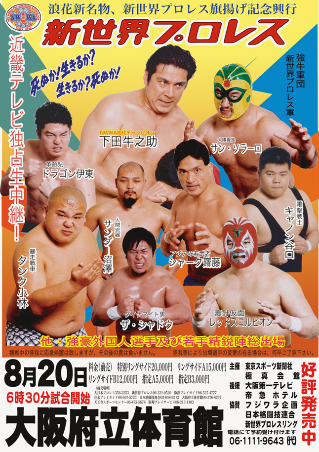 2004年の公開からハヤ五年の歳月を経過した訳ですが、感動は今も尚色褪せる事は御座居ません・・・。 天才子役と謳われた神木隆之介くんの半ズボン姿も瑞々しく、原作の中島らもさんは,理容室のご主人役で出演しています。 大阪を舞台にした この作品ですが、実際は全て関東近郊で撮影されて居ます。 良くぞココ迄大阪らしい所を探して来たなと感心する事しきりな訳ですが、そんなスタッフの努力の跡も,見所と云えば見所です。 そして影の助演男優賞は,なんと言っても大日本プロレスの皆さんです・・。 台本を読んだ時に,これは「大日本プロレス」にしか出来ない作品だと直感的に思い、プロデューサーの原田さんに電話した事を思い出します・・。 なんか不器用なんだけど・・一生懸命な所が心に届いたのかも知れませんな・・・。 他にもプロレスファンなら解ると思いますが、スナックのホステス役で玉田凛映選手(当時)も見事な受け身を披露してます・・・。 話すと物凄く長くなる想い出の一杯詰った作品ですが、色々な人との縁を物凄く感じる作品でもあります。 機会が在ったら是非劇場で、もう一度感動を分かち合いたい物ですな・・・。 大日本の選手達も来る様なので、想い出話も楽しみです。 【3月14日【土】 ホワイトデー・イベントを開催!】 ☆大日本プロレスプレゼンツ・ハッピーホワイトデー☆ 映画「お父さんのバックドロップ」上映会 大日本プロレスの選手スタッフが、全面バックアップの感動ムービーが劇場に帰ってくる! 【日時】3月14日(土) 開始時間 20時30分~ 【会場】シネマ・ジャック&ベティ 【住所】神奈川県横浜市中区若葉町3-51 【TEL】045-243-9800 【内容】大日本プロレス所属選手による、撮影時の裏話などのトークあり 【料金】ファンクラブ会員 500円、一般1000円 【アクセス】 ◆京浜急行線 黄金町駅下車 徒歩5分 ◆横浜市営地下鉄 阪東橋駅下車 徒歩7分 ◆JR線 関内駅下車 徒歩15分 横浜の名館ジャック&ベティで、故中島らもさんの名作を一緒に鑑賞しませんか? 心の温かさとプロレスの素晴らしさ、その二つがじんわり胸にしみこむ感動の名作を選手と一緒にスクリーンで・・ ジャック&ベティー 画像は、映画の中に出て来る新世界プロレスの旗揚興行のポスター・・・。 みんな若い!! |