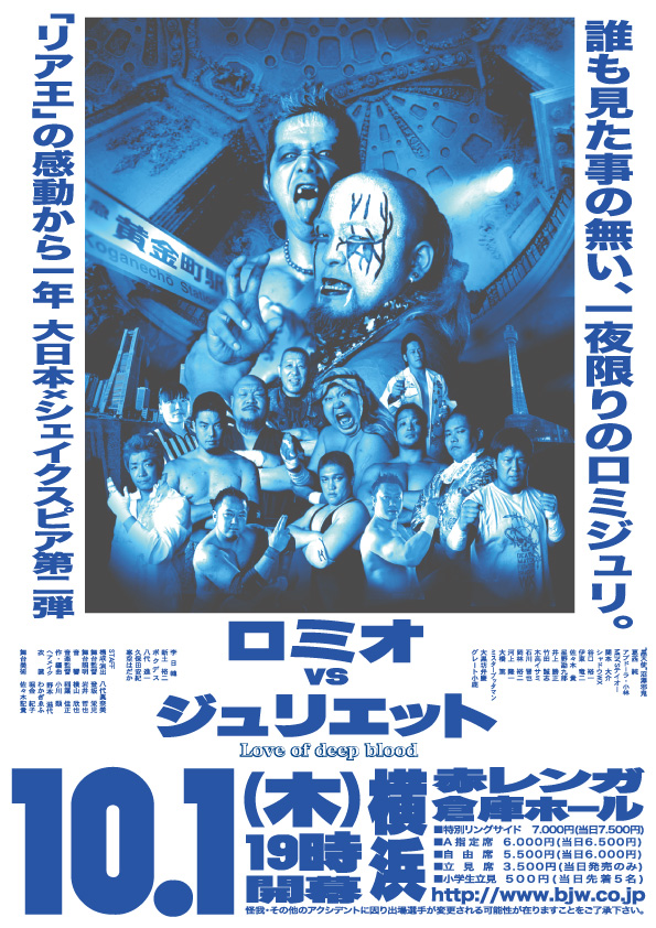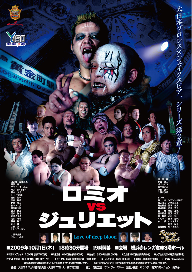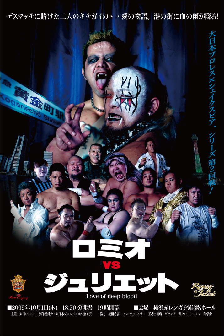 「ロミオvsジュリエット」 【開催日時】2009年10月1日(木) 18:30開場・19:00開幕 【会場】横浜赤レンガ倉庫1号館3階ホール 【住所】神奈川県横浜市中区新港一丁目1番 【会場のお問い合わせ】045-211-1515 【アクセス】 ■JR・市営地下鉄「桜木町駅」より汽車道経由で徒歩約15分 ■JR・市営地下鉄「関内駅」より徒歩約15分 ■みなとみらい線「馬車道駅」または「日本大通り駅」より徒歩約6分、「みなとみらい駅」より徒歩約12分 【入場料金】 ■特別リングサイド 7,000円(当日7,500円) ■A指定席 6,000円(当日6,500円) ■自由席 5,500円(当日6,000円) 【チケットのお問い合わせ】 ■大日本プロレス事務所 TEL:045-507-1751 【出場選手・出演者】 “黒天使”沼澤邪鬼 葛西 純 アブドーラ・小林 MEN’Sテイオー 関本 大介 シャドウWX 谷口 裕一 伊東 竜二 佐々木 貴 星野勘九郎 井上 勝正 佐々木義人 竹田 誠志 木高イサミ 石川 晋也 岡林 裕二 河上 隆一 大橋 篤 宮本 裕向 李日韓 大黒坊弁慶 グレート小鹿 ミスターブッタマン ボクデス 八代 進一 久保田安紀 寒空はだか STAFF 構成・演出 八代眞奈美 舞台監督 登坂 栄児 舞台照明 岩井 哲也 音 響 横山 欣也 音楽監督 稲葉 佳正 作・編 曲 小川 類 ヘアメイク 野本 滋代 衣 裳 わかぎゑふ 舞台美術 佐々木記貴 |