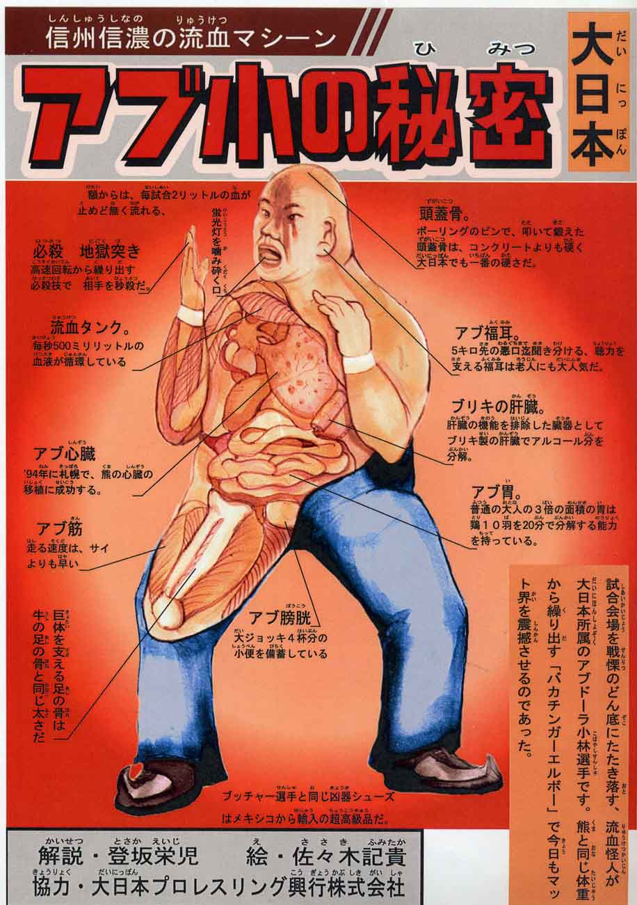 子供の頃は、ウルトラマンや怪獣映画全盛時代でしたから、当時流行して居りました少年マガジンや、朝日ソノラマの「怪獣解剖図鑑」なんかは穴が開く程読んで居ました。 今の子供の様に、ゲームやDVDやインターネットなんて楽しい物は在りませんから、人生のうちの記憶力なんて物は、その時代に使い切って仕舞ったのでは無いかと云うぐらい、漫画を読み、TVを集中して観てセリフ迄暗記した物なのです。 いま頭が悪いのは、当然その時のリバウンドだと思って居ますから、同世代の馬鹿君達に出会う度に「集英社と東映と永井豪先生を相手取って集団訴訟でも起こすか・・」と本気で想う今日この頃です。 そんな幼少期に、暇さえあれば大伴昌司先生の影響にどっぷり浸かった解剖図解のイラストばかり書いていた訳ですから、ロクなオトナに育つ訳がありません。 しかし当時の解剖図は、世界的に見られた傾向では無く、日本独自の様な物と思われます。 エンジンや船舶や車なんかのカットモデルや構造図は見た事はありますが、スパイダーマンの体内やらデススターの中やらスーパーマンの体内やらの、解剖図なんか見た事もありません。 あんなグロテスクなインチキ科学イラストを真剣に見て居た世代なんか、恐らく人類の歴史の中でも、浩宮様を含む我々の様な昭和の子供達だけだった事でしよう。 そんな変な子供達が、大人になってマニアックな構造の家電製品やら、家庭用品やら味噌の容器やら妙に速い電車なんかを設計して居る訳ですから、本当に困った物です。 と言う訳で、画像はインチキな機械の構造図の下絵です・・・。 変な形状の機械や部品にもっともらしい名称を付けて、それらしいキャプションを付けて完成です。 科学的な根拠も裏付けも全くありませんが、コンセプトを考えてから技術と言う物が追い掛けて行くそうなので、完成して仕舞う場合もあるそうなのです。 御陰様で、こんなイラストなら果てしなく書き続けられます・・。 オマケにこちらのイラストは、大日本プロレスアブドーラ小林選手の解剖図。 こちらは割と事実に基づいて正確です。 |